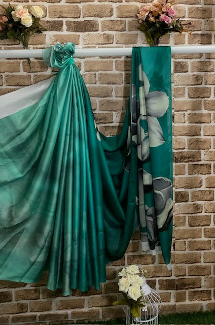 Sea green Crepe Satin Saree Fabric Floral Print Fabric, Wedding Dress fabric, Fashion Fabric, Party Fabric, Occasion Wear - SR01